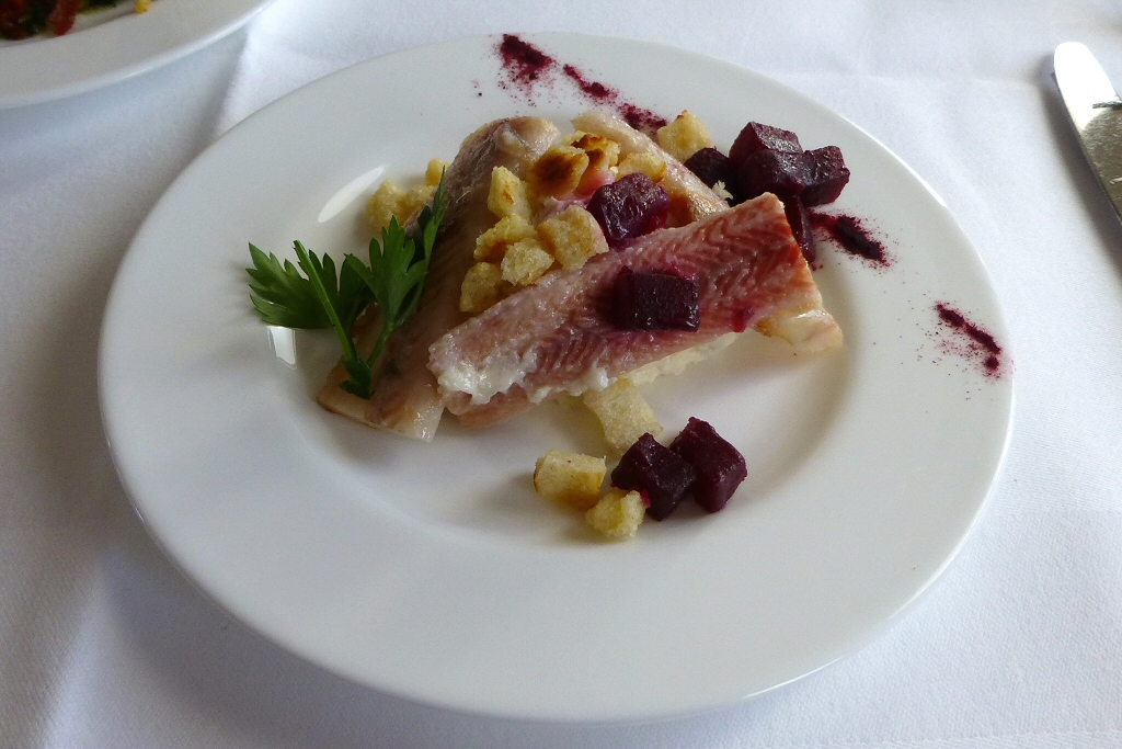 Smoked Eel, Apple, Celery, Horseradish and Beetroot.