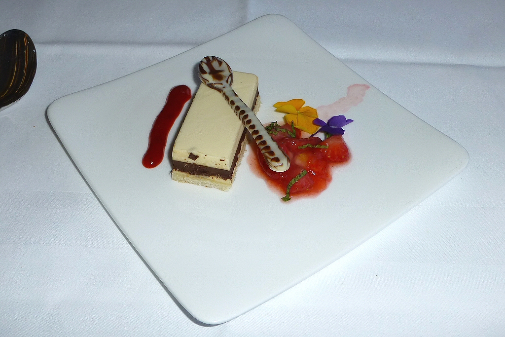 Slice of White Mousse with marinated Strawberries.
