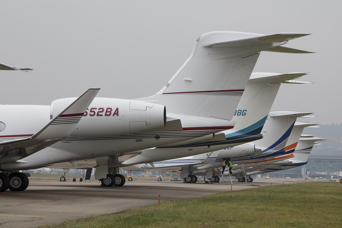 Kommentar/ Remark | Line-Up von zahlreichen Business Jets am Whiskey Vorfeld. Line-up of some business jets at Whiskey stands. |