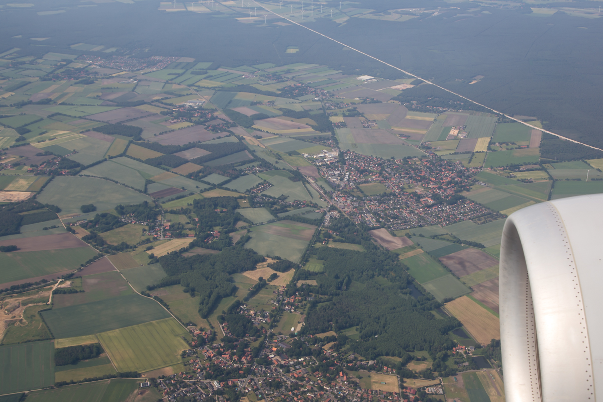 Kommentar/ Remark | Die Stadt Wedemark mit dem Ortsteil Elze während des Landeanfluges auf Hannover-Langenhagen. The city of Wedemark with the district Elze during final approach at Hanover-Langenhagen. |