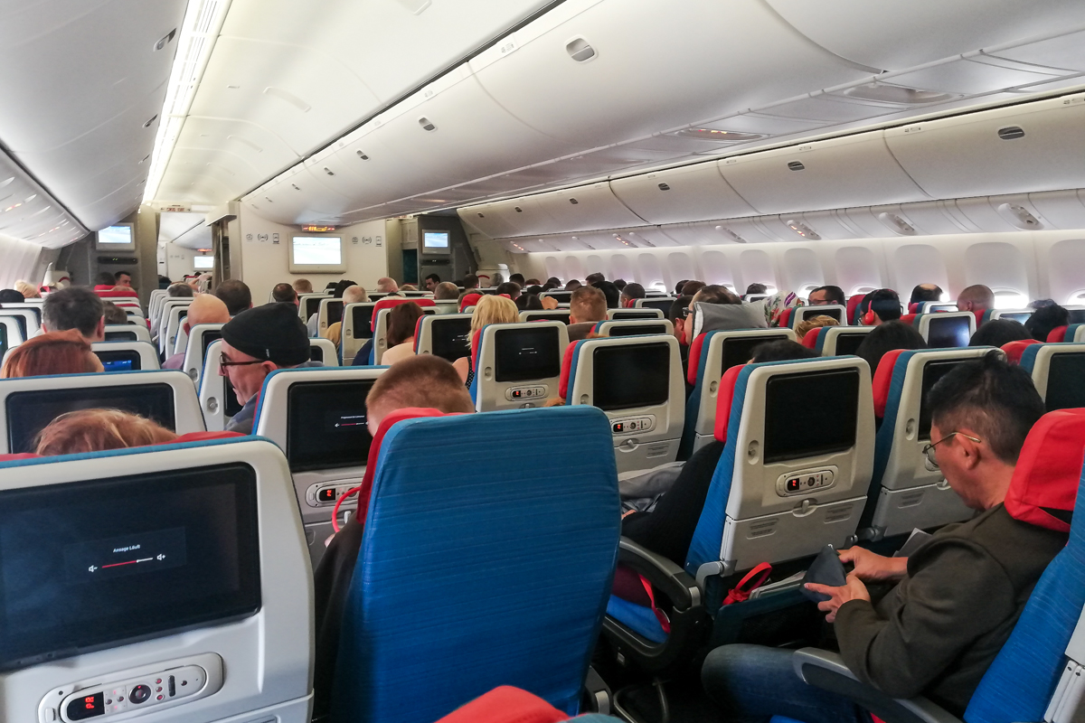 Blick in die Economy Class kurz vor der Landung auf Landebahn 02L.