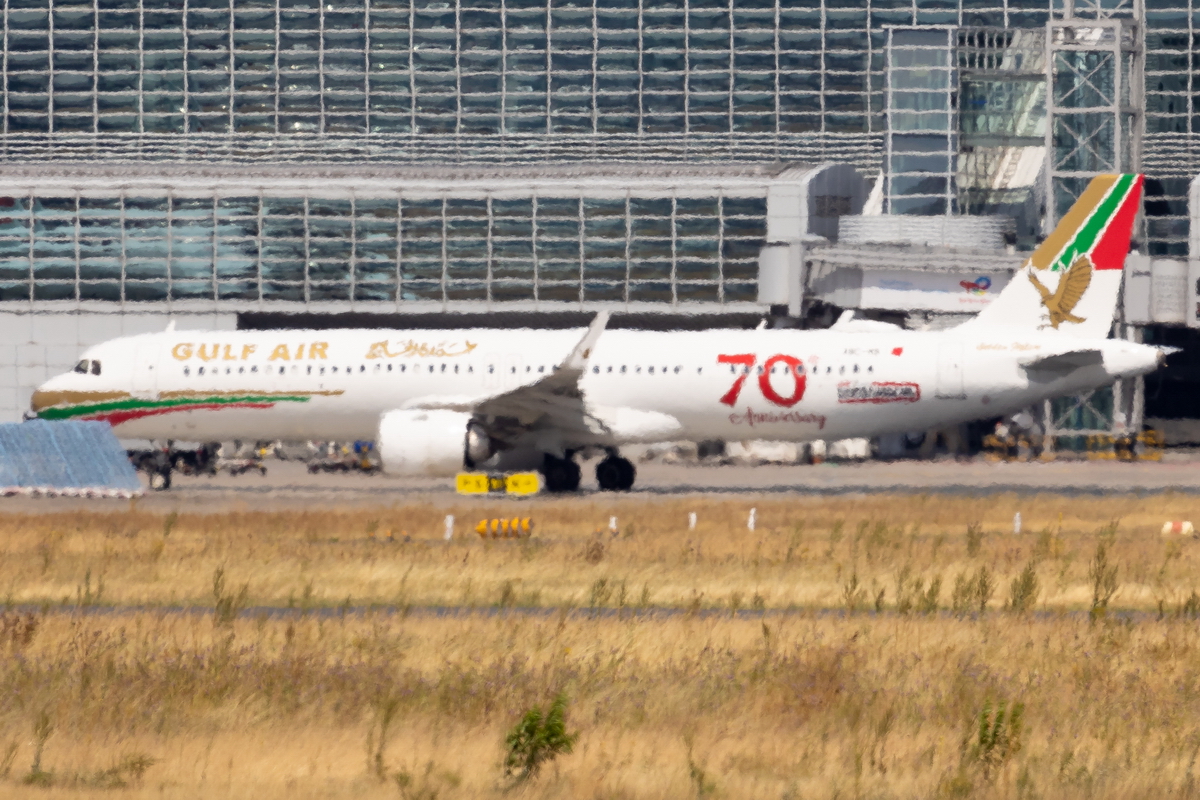 Kommentar/ Remark | 'Gulf Air 16' nach Bahrain auf dem Weg zur Startbahn 18. A321neo in Retrobemalung. 'Gulf Air 16' to Bahrain taxiing to runway 18. A321neo in retro livery. |