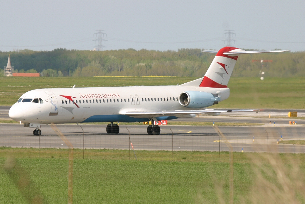 Kommentar/ Remark | Austrian Fokker 100 beim Verlassen der Landbahn 16. Austrian Fokker 100 vacating runway 16 after landing |