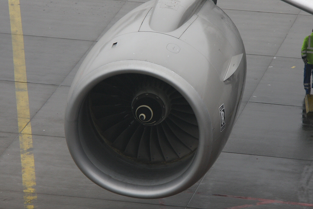 Kommentar/ Remark | Blick auf die das riesige Rolls Royce Triebwerk. View to the massive Rolls Royce engine. |