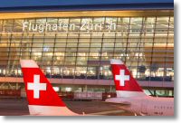 Terminal mit 2 Swiss Flugzeugen im Vordergrund.