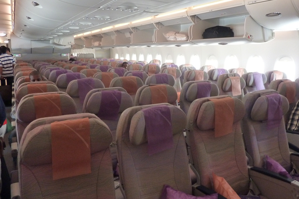 Kommentar/ Remark | Economy Kabine während dem Boarding zum Flug nach Dubai. Economy cabin during boarding for the flight to Dubai. |