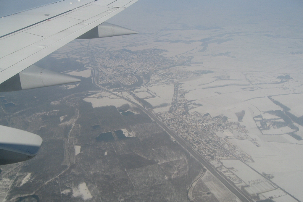 Snow covered country during flight to Vienna.