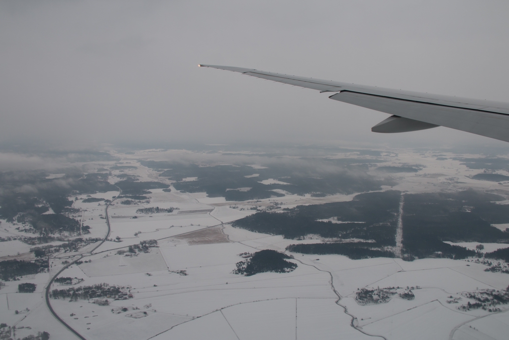 Kommentar/ Remark | Erster Blick auf die schneebedeckte Landschaft nahe Stockholm. First view down to snow covered landscape near Stockholm. |