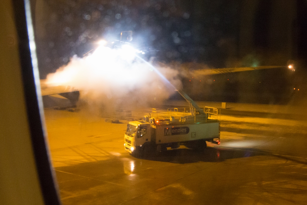 Kommentar/ Remark | Die Maschine wird vor dem Start noch enteist. Ground staff is deicing the aircraft prior departure. |