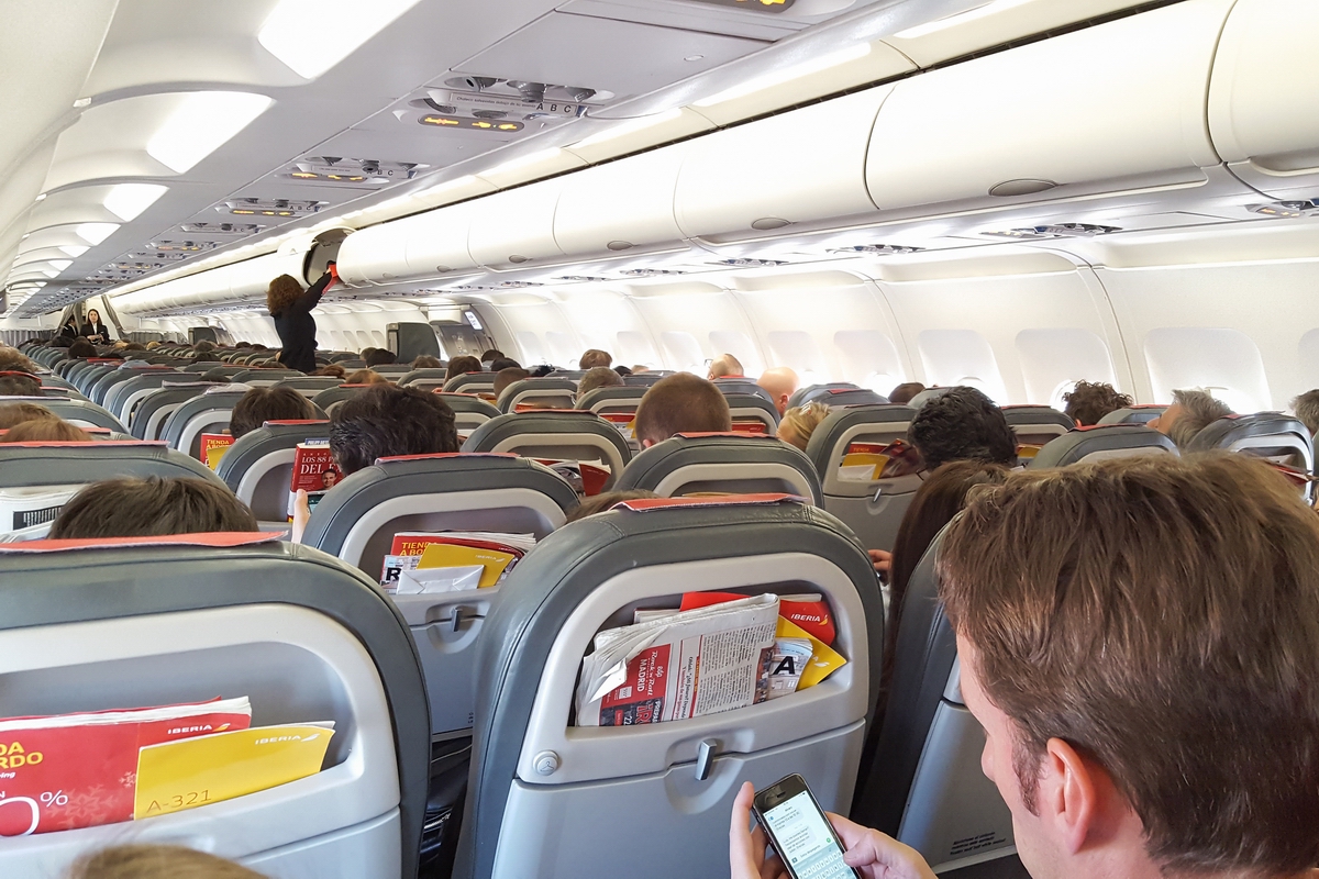 Economy class cabin this fully booked A321 flight to Madrid.