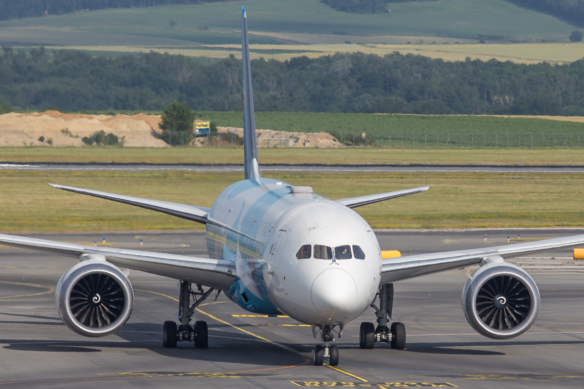 Kommentar/ Remark | Frontalansicht einer 787-9 während sie zur Parkposition rollt. Front view of a 787-9 during taxiing to park position. |