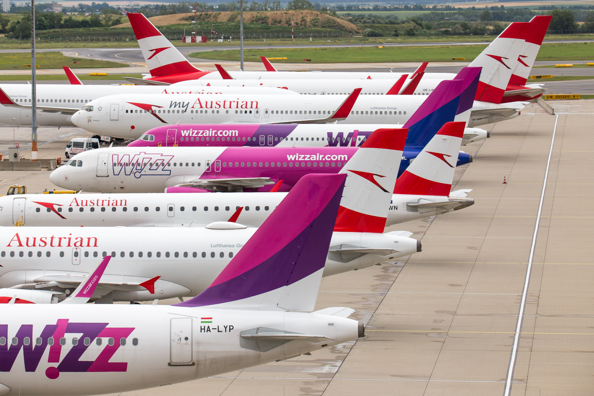 Kommentar/ Remark | Vorfeld H mit Austrian und Wizzair Flugzeugen, teilweise noch abgestellt, andere schon wieder im Einsatz. Apron H with Austrian and Wizzair aircraft, some still parked, others already in use. |