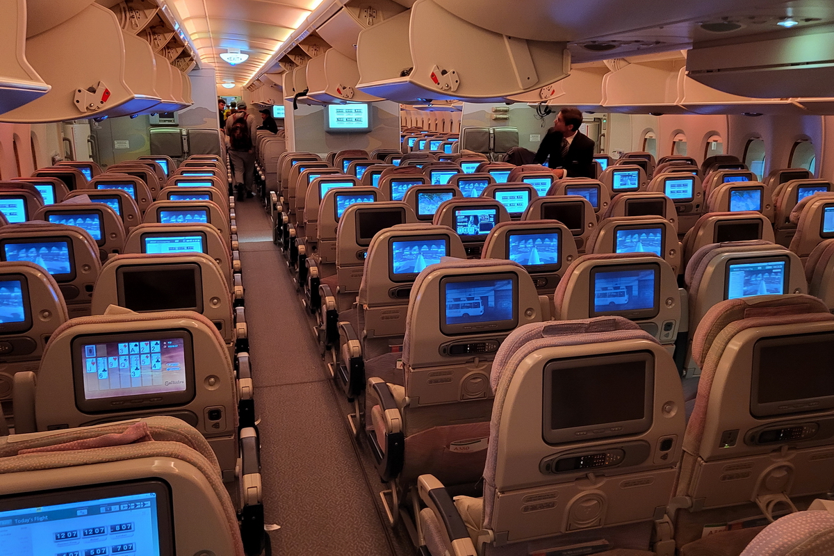 Most of the passengers have already left the plane after landing.