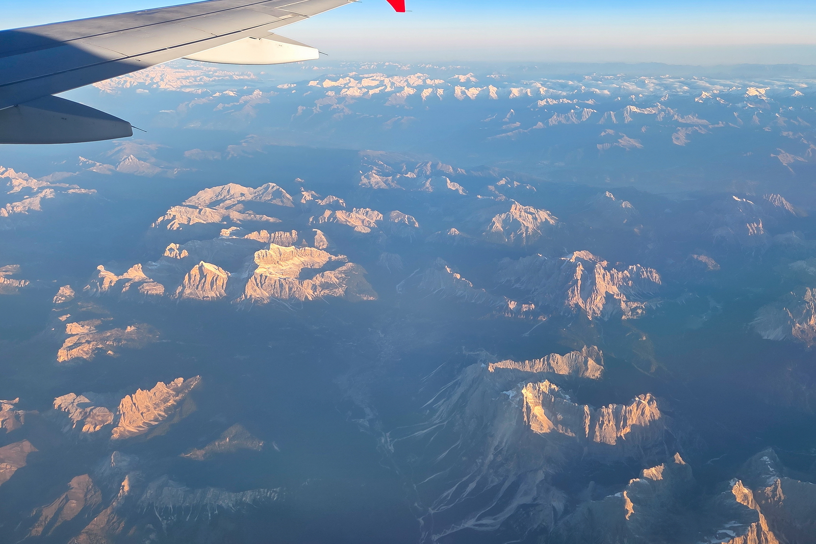 The mountain peaks are beautifully illuminated by the rising sun.