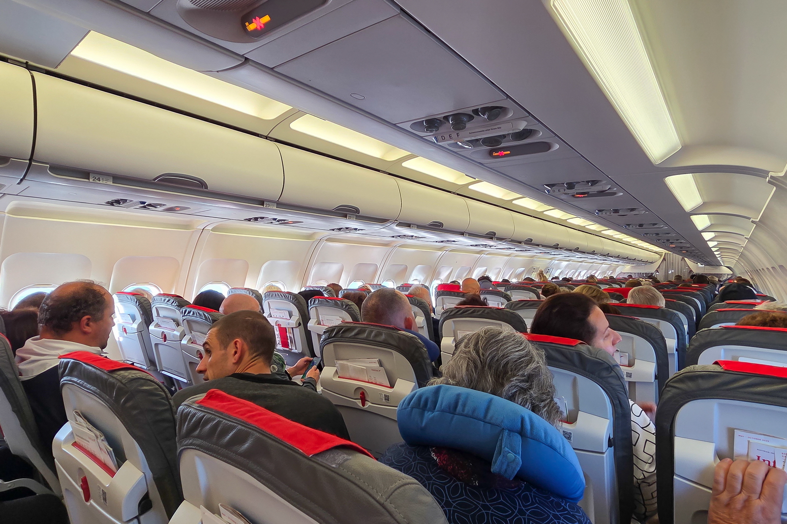 The cabin of this A320 is very bright and pleasantly lit.