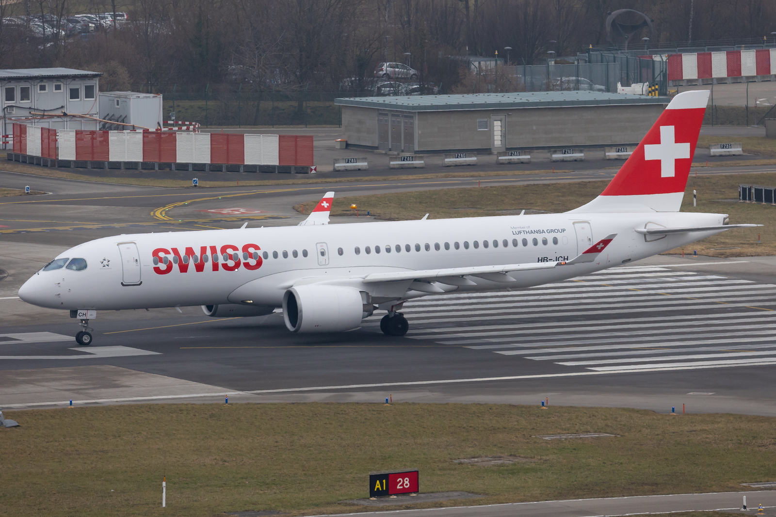 Kommentar/ Remark | 'Swiss 1018' nach Düsseldorf auf dem Weg zur Startbahn 28. 'Swiss 1018' to Dusseldorf taxiing to runway 28 for departure. |