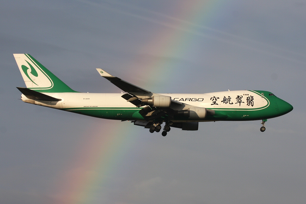 Kommentar/ Remark | 'Jade Cargo 7443' aus Chongqing kurz vor der Landung mit Regenbogen im Hintergrund. 'Jade Cargo 7443' from Chongqing prior to landing with nice rainbow in the background. |